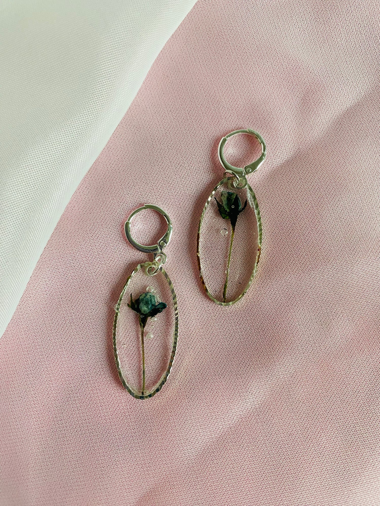 Pressed flower in resin in hypoallergenic stainless steel.