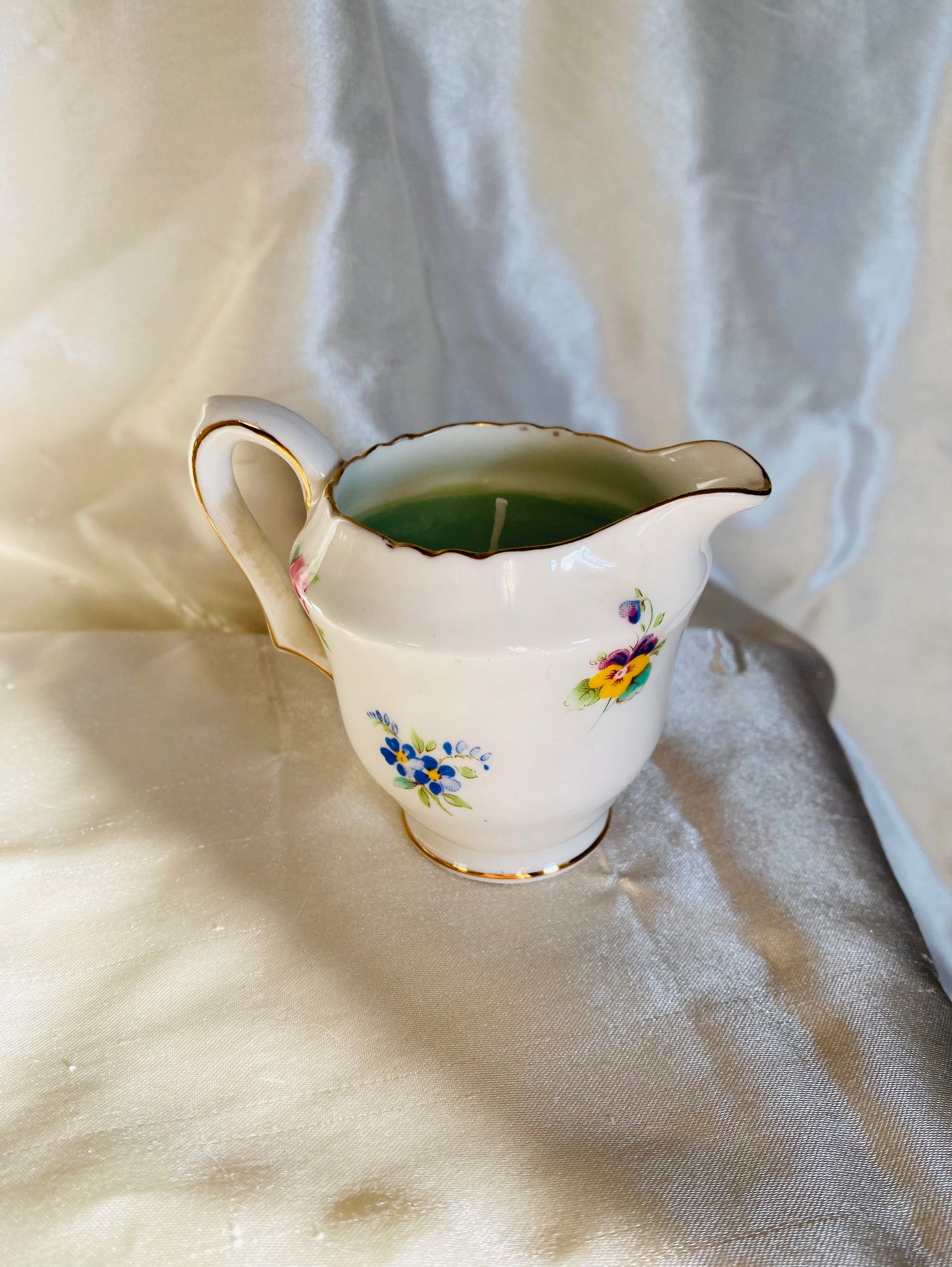 Vintage China creamer bell with hand poured organic soy wax and balsam scent.