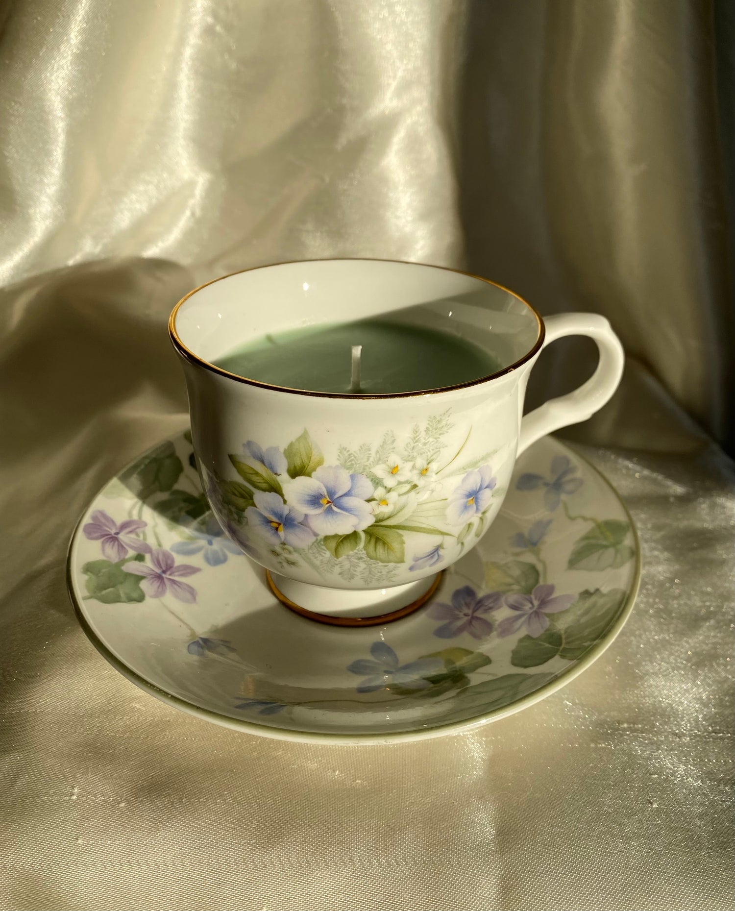 Vintage China tea cup with hand poured organic soy wax and balsam scent.