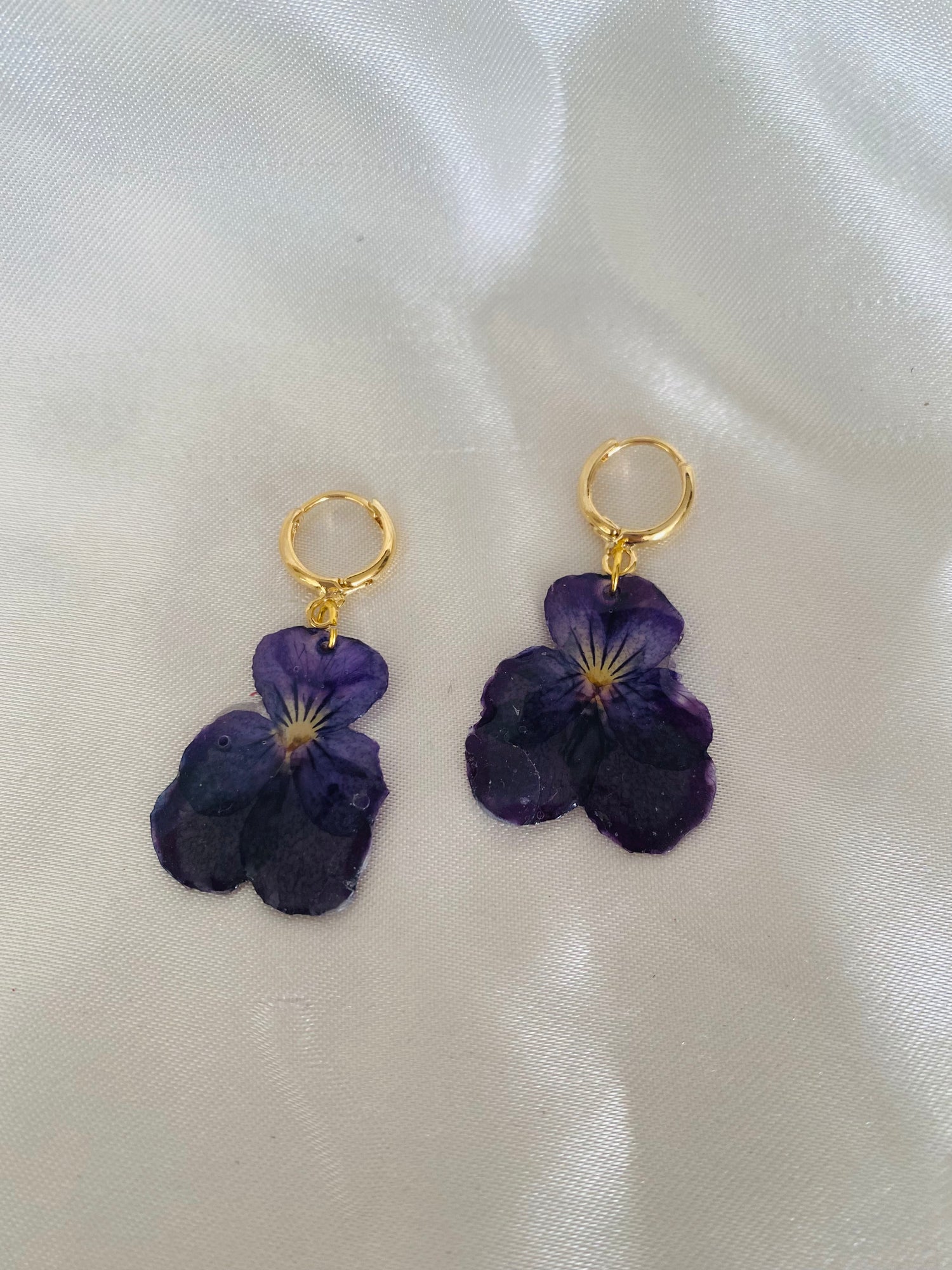 Dried flower in resin with gold hypoallergenic stainless steel hoops.