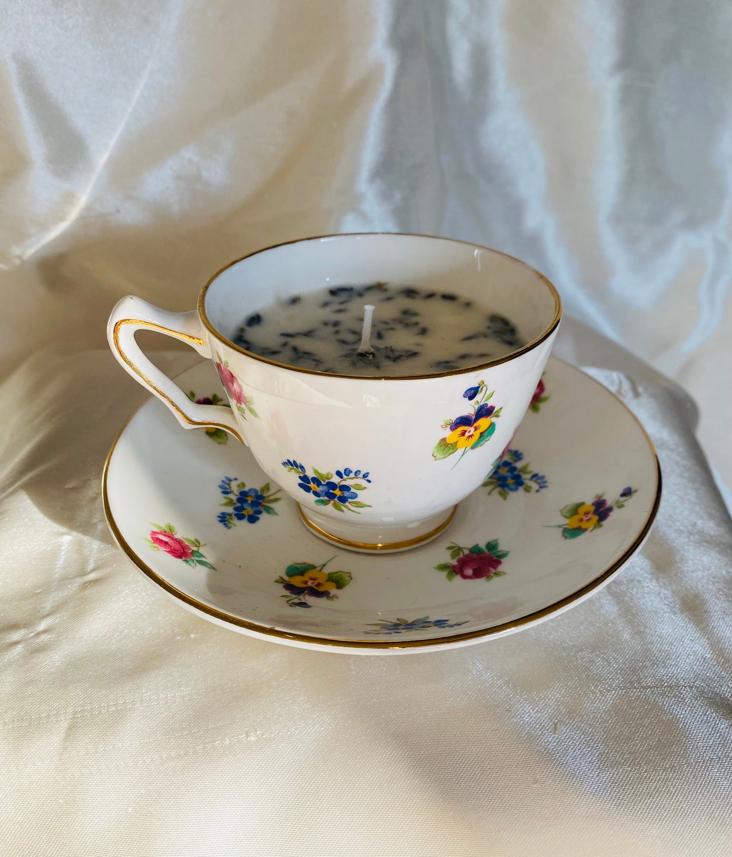 Vintage English China Tea Cup with hand poured organic soy wax and fresh linen scent.